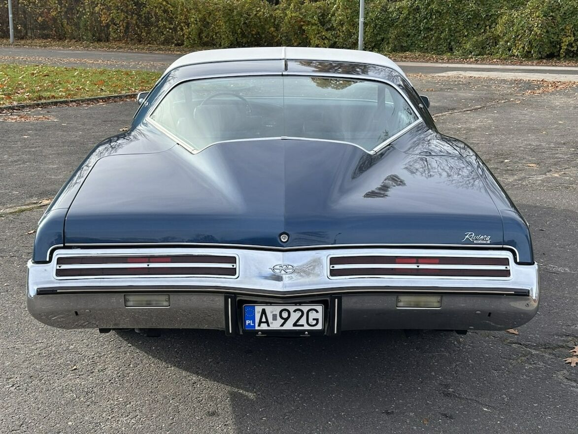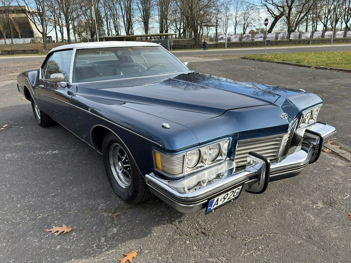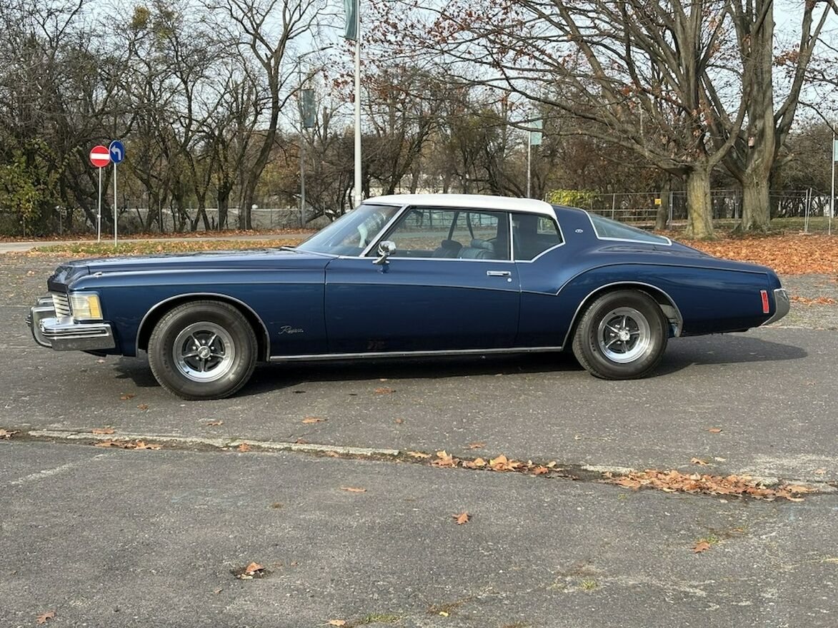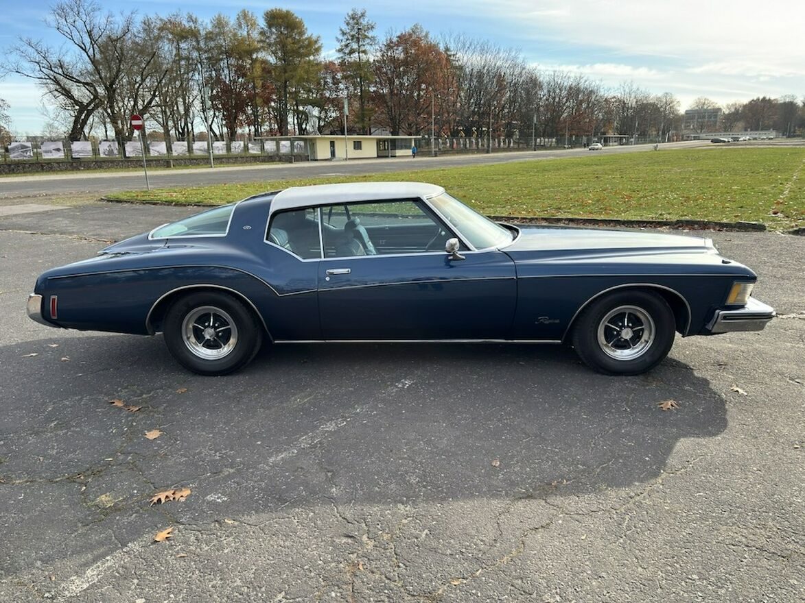 BUICK RIVIERA 1973Na sprzedaż Buick Riviera z 1973 roku w kolorze granatowym z kontrastowym białym dachem vinylowym. Auto wyposażone w silnik V8, automat z dźwignią przy kierownicy oraz klasyczny tylny napęd (RWD).
