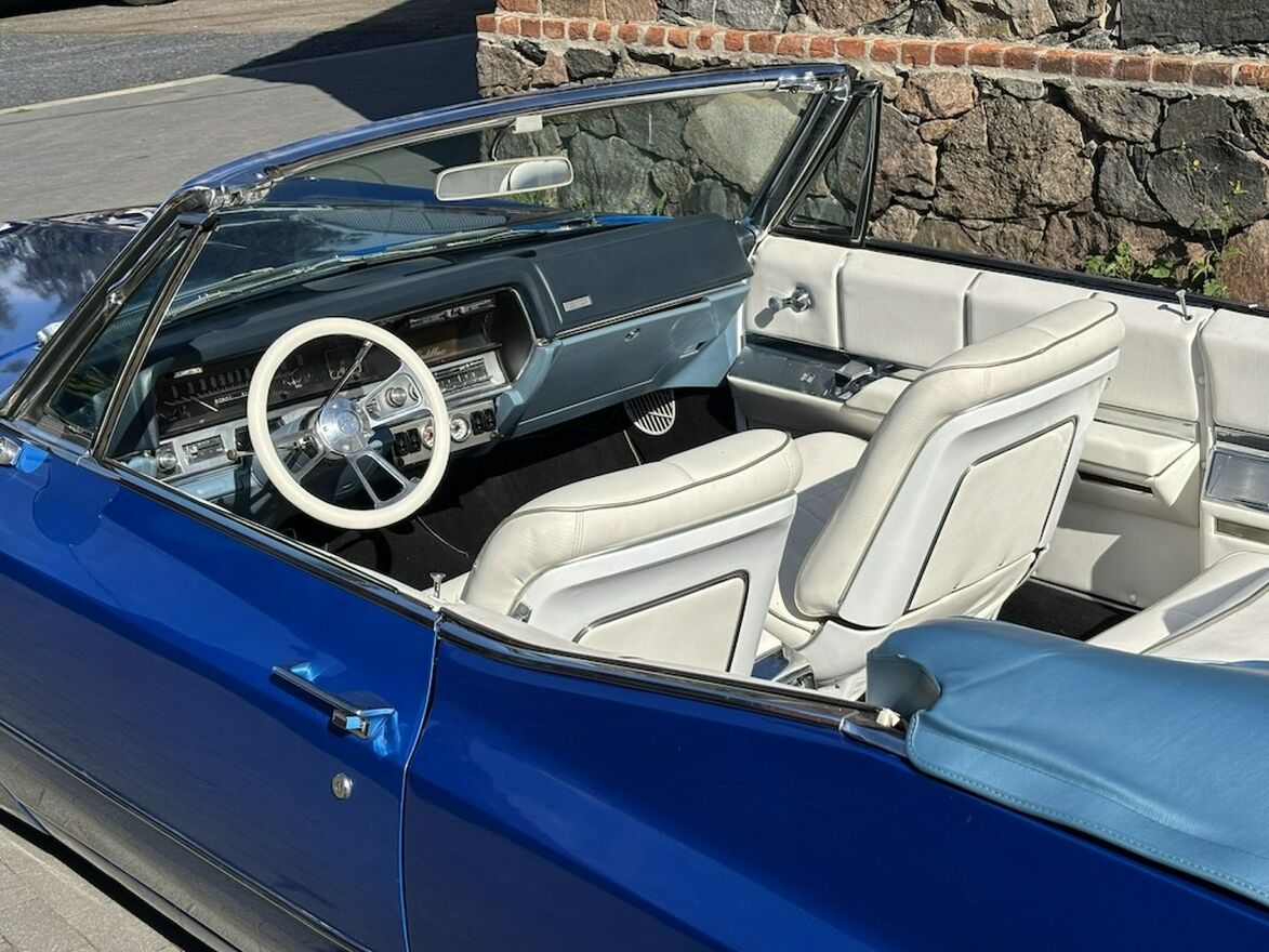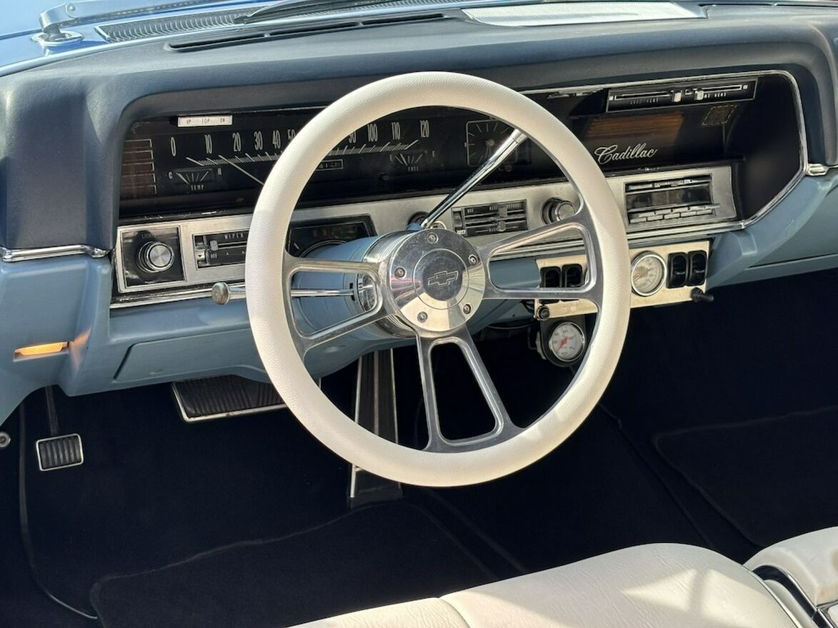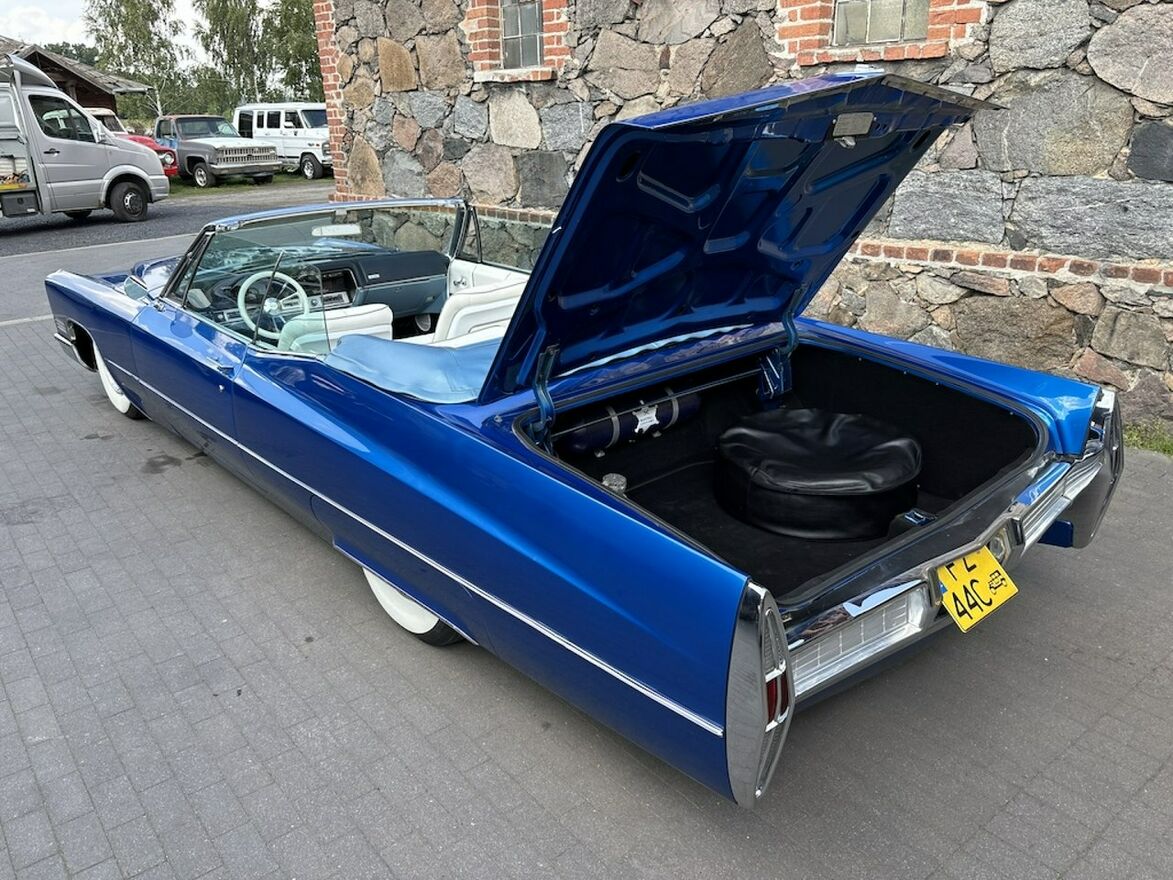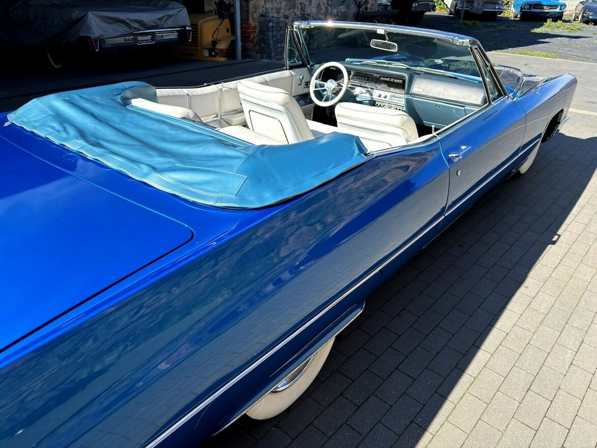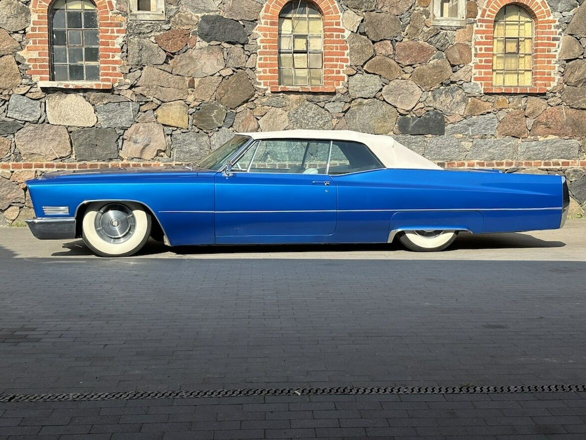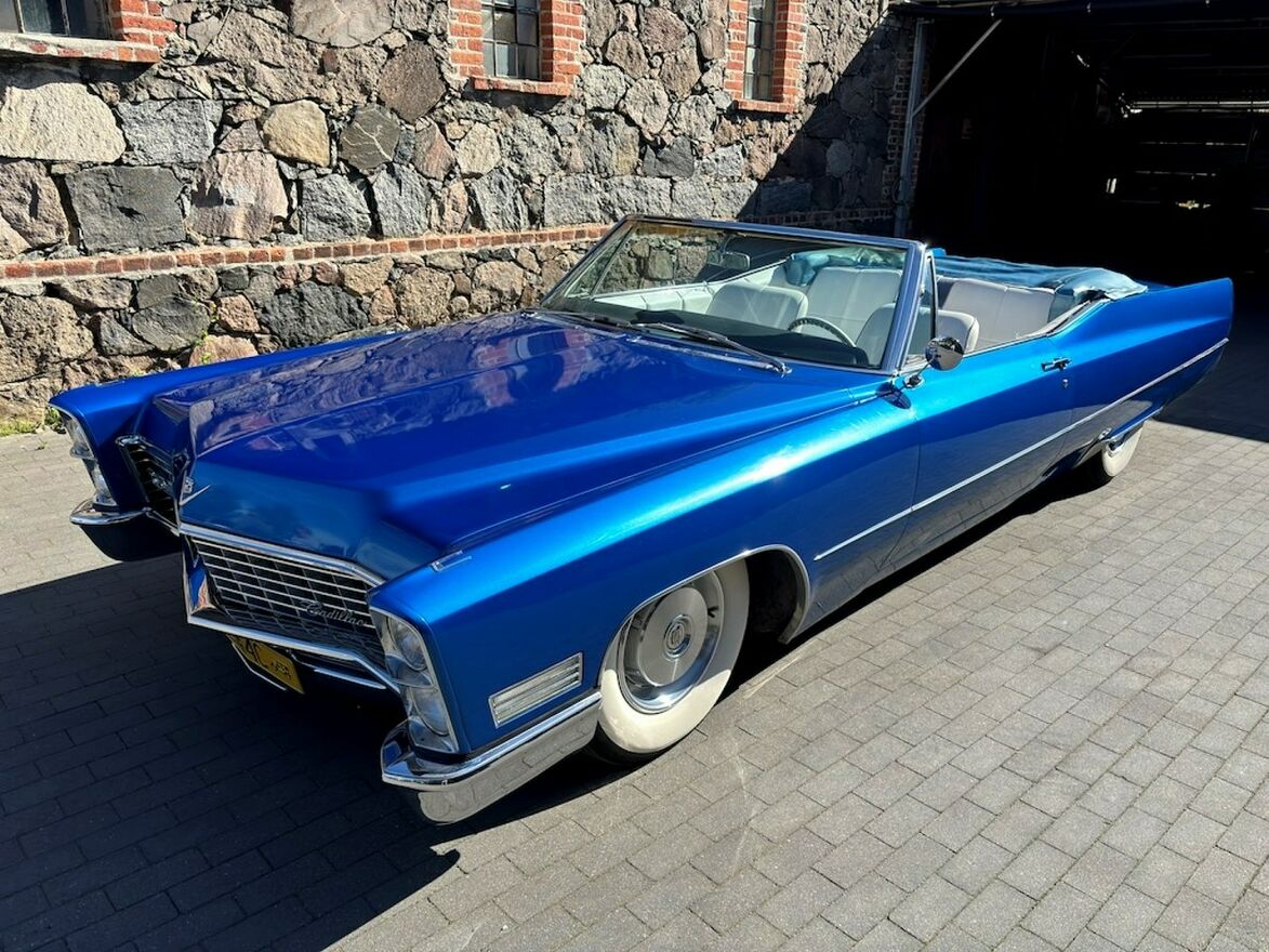 Cadillac DeVille Convertible z rocznika 1967 z silnikiem 429 cui czyli 7,0 litrów pod maską oraz zespolony z automatyczną skrzynią biegów. Ładne białe wnętrze, dach również w kolorze białym idealnie pasującym do tej sylwetki. Dach otwiera się elektrycznie co można oglądnąć na załączonym Video.Cadillac posiada system Air Ride co umożliwia podnoszenie oraz opuszczanie tylnej części samochodu. Na koła zostały założone klasyczne opony z szerokim białym pasem co jeszcze mocniej podkreśla klasyczną stylistykę auta.