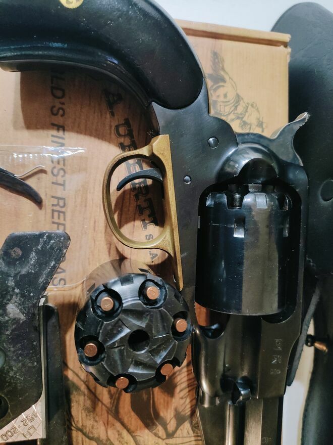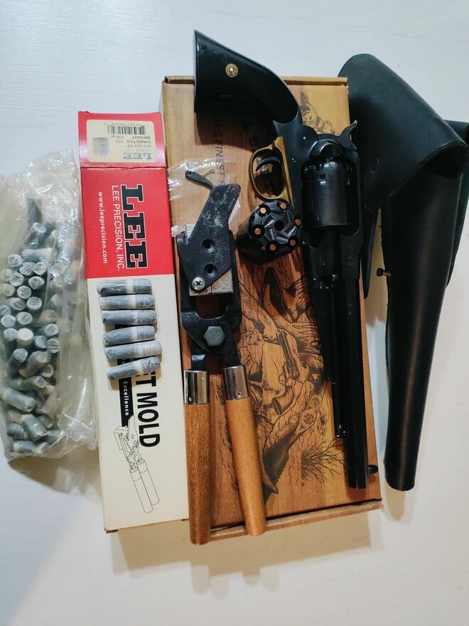 Rewolwer czarnoprochowy Remington 1858 New Model Army firmy Uberti kal.44 z lufą długości 8″. Produkt mało używany, sprawny w 100%. Do rewolweru w pakiecie - zapasowy beben, popychacz bebna, kabura, kokila i troche bonusów. Sprzedaje tylko Osobie pełnoletniej na podstawie umowy.W myśl art. 11 ust. 10 ustawy o broni i amunicji nie wymaga pozwolenia na broń posiadanie broni palnej rozdzielnego ładowania wytworzonej przed 1885r bądź jej repliki, jak i nie wymaga zezwolenia na jej przenoszenie. Za tem jest to wspaniale urzadzenie do samoobrony.