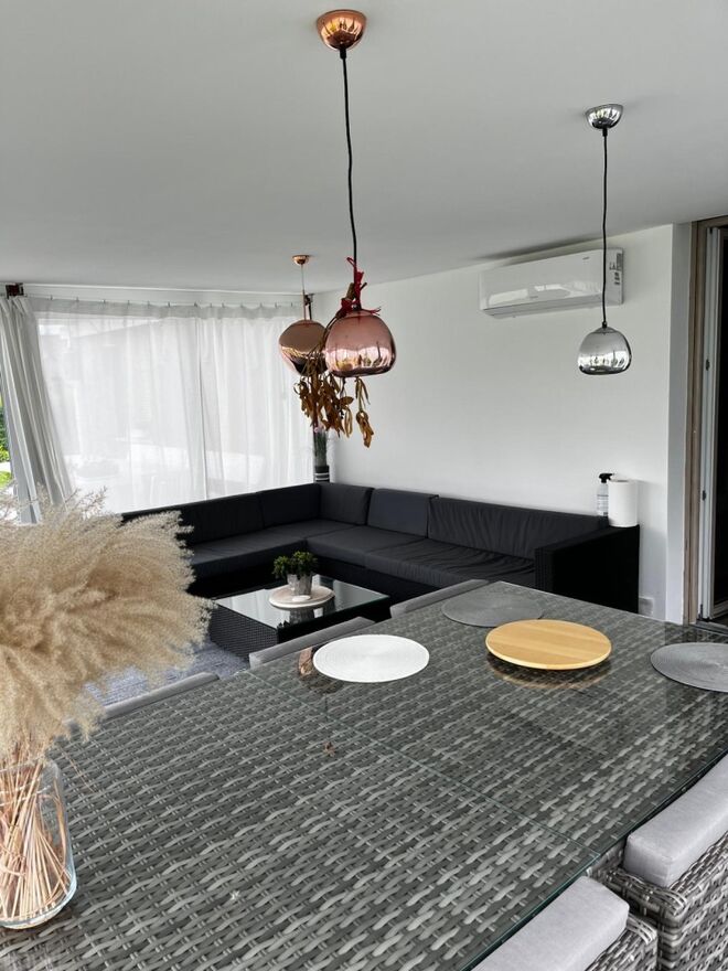 Dom ogrzewany jest za pomocą pompy powietrze-powietrze.Ogród zewnętrzny posiada nawodnienie oraz strefę relaksu jaką jest Jacuzzi całoroczne.